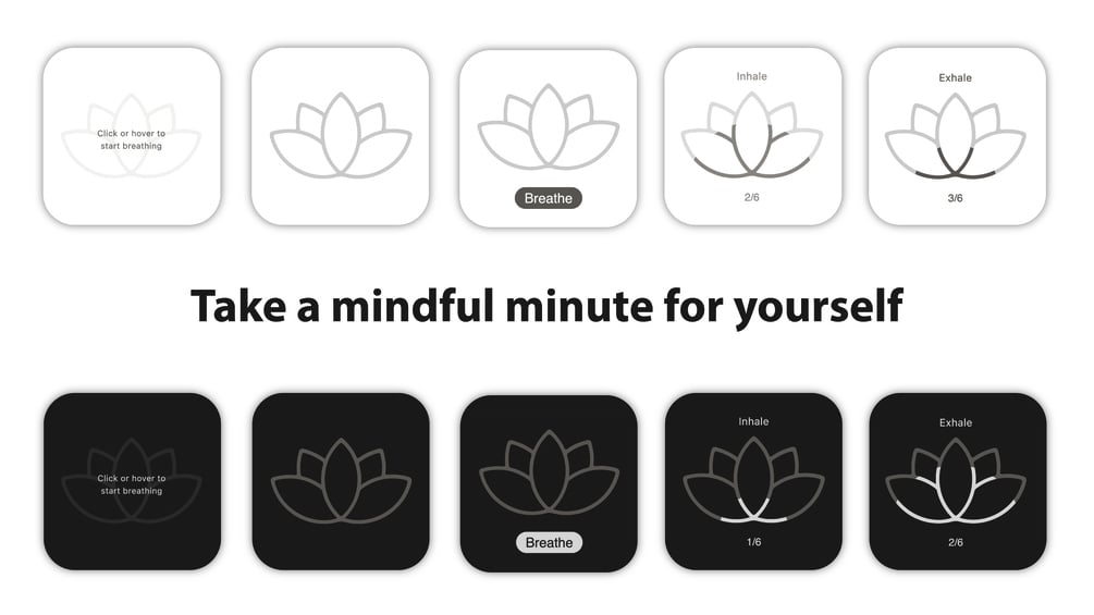 The Breathe Widget is aesthetically pleasing and simple to use. When not in use, it remains a helpful reminder that we always have a minute to spare for our mental wellness. With a comfortable rate of six breaths per minute it's suitable for most people. Take a mindful minute before an event that makes you nervous, when handling a stressful situation, or simply when you need a moment for yourself!